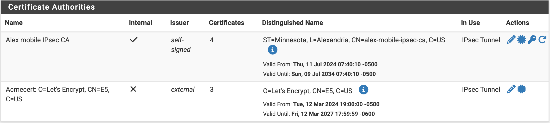 The IPsec tunnel is configured using mutual cert authentication using LE certs and has been working properly for some time. Initially I had trouble getting the tunnel to establish and the solution was to manually add the ISRG Root X1 CA cert which was necessary to get IPsec to trust intermediate CA certificate "C=US, O=Let's Encrypt, CN=R3" That seemed like a hack at the time but I was not able to get it to work otherwise; PKI is not one of my core competencies!