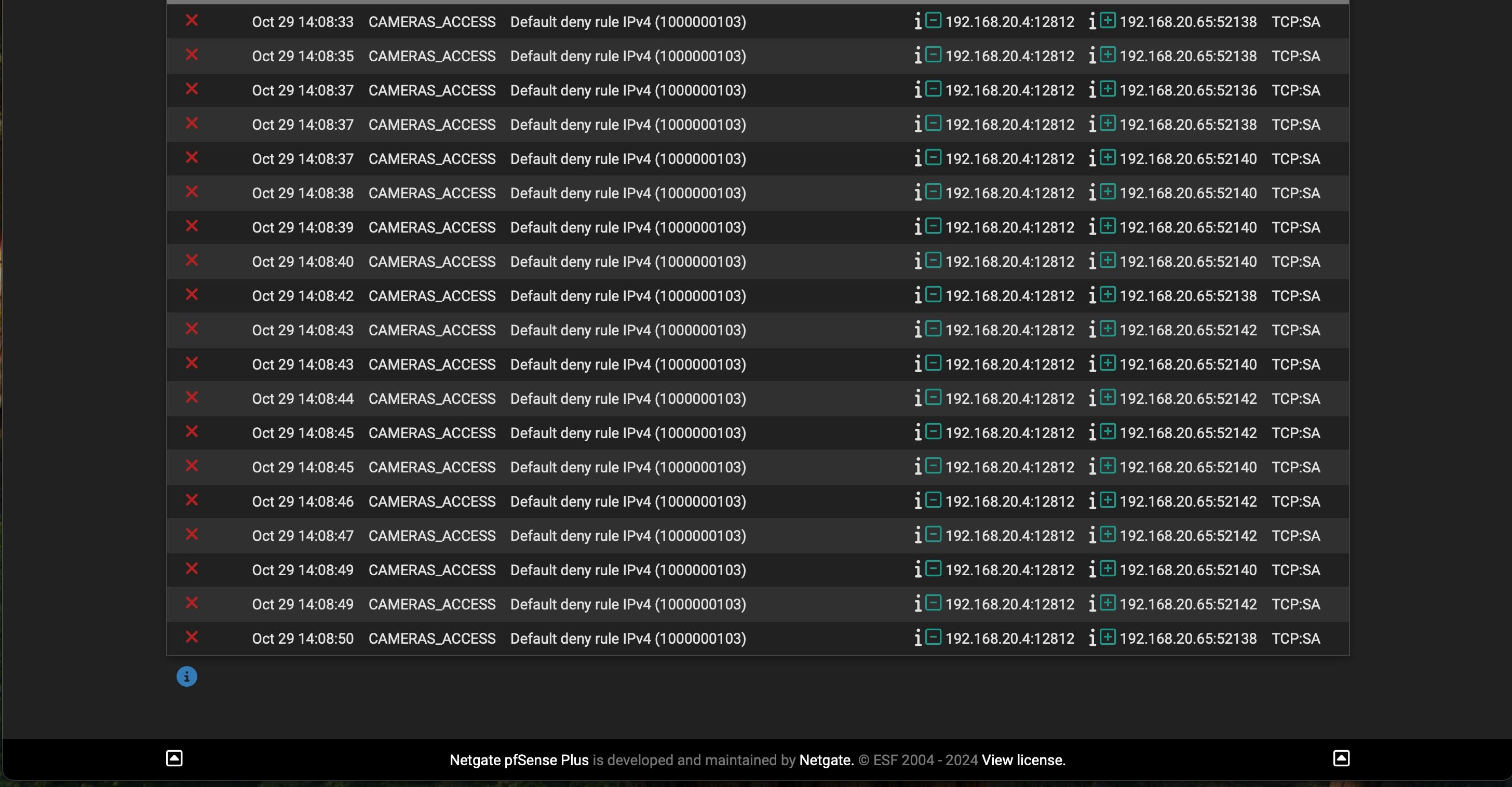 This is the first time I am having a problem on PFSense with a firewall rule and I must be missing something simple! I keep seeing 192.168.20.4 being blocked from accessing 192.168.20.65, when my first and third rule should be allowing this! I only added the first two rules listed here after the third appeared to be failing. Any suggestions on what I might be missing? I have refreshed state table and rebooted the firewall as well. Thank you!