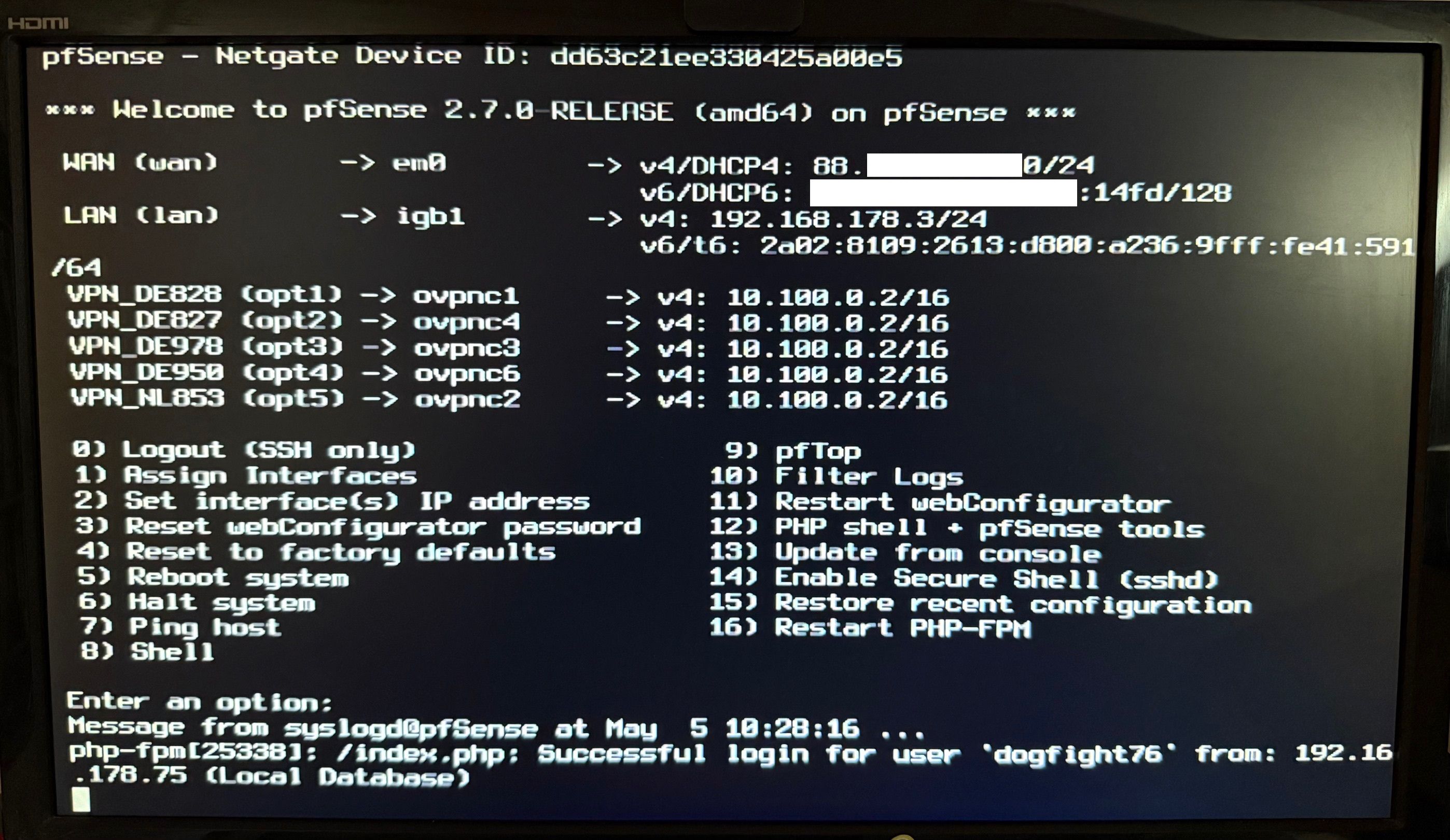 Und wie du Per Terminal auf die pfSense kommst, findest du auch in der Offiziellen Dokumentation, du musst Sie nur Lesen, ich habe nicht die Lust und Nerven dir das hier zu erklären -