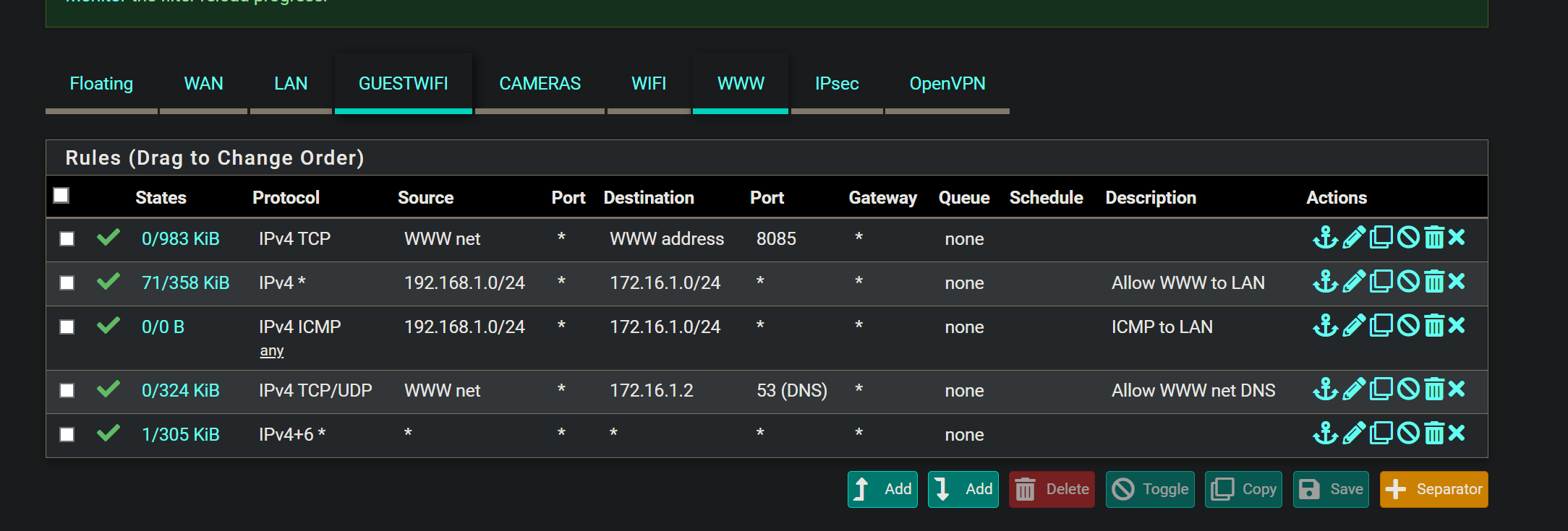 I have tried several rules on the LAN side, the VLAN side, and back, but none seem to work. I can add a rule to hit the WebGUI, and it works. So, I believe the rules are working, but I am just stuck.
