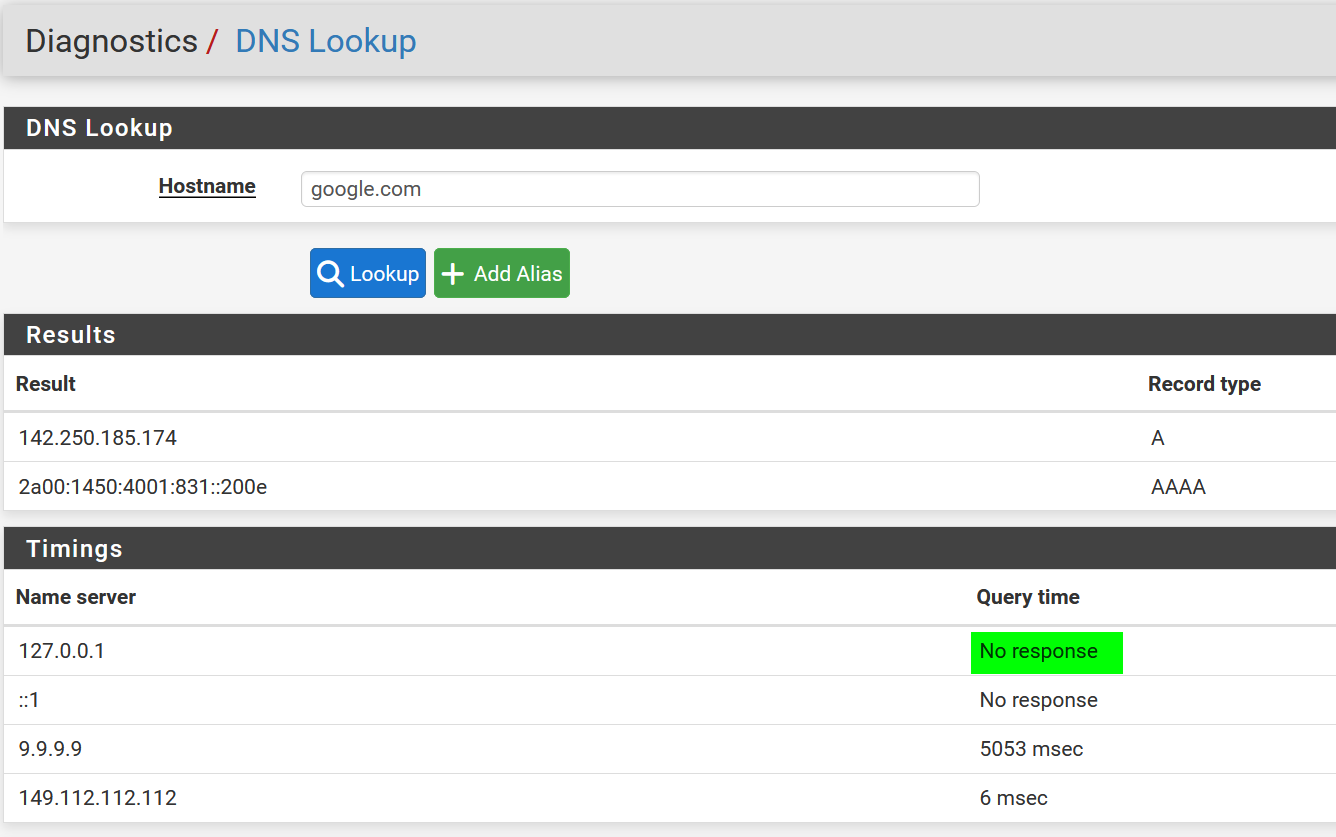 With just LAN and Localhost resolution for internal works instantly, but public addresses fail.
