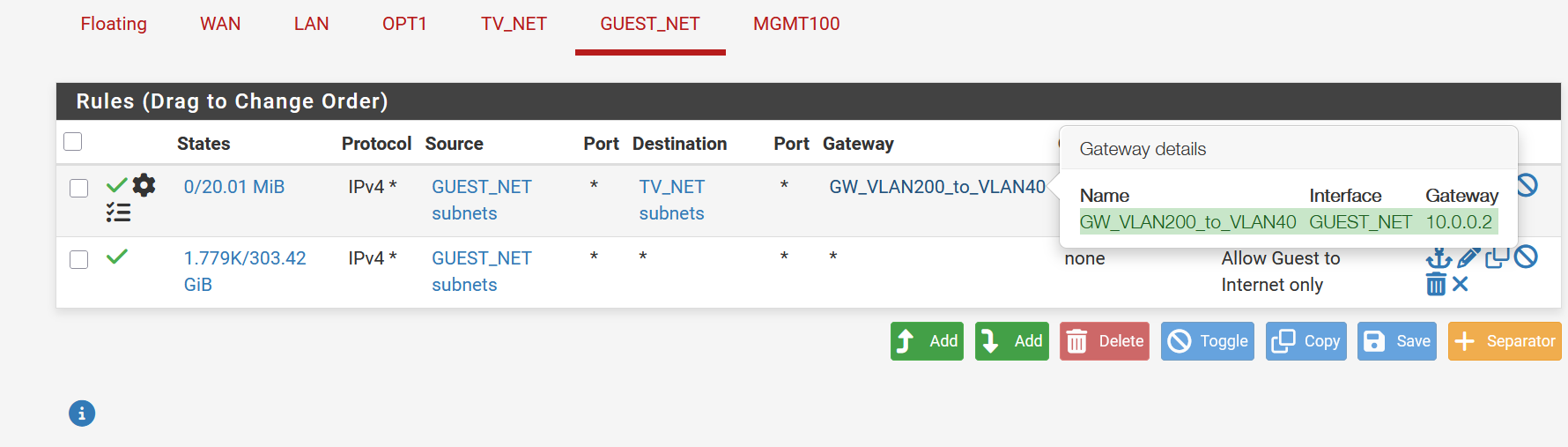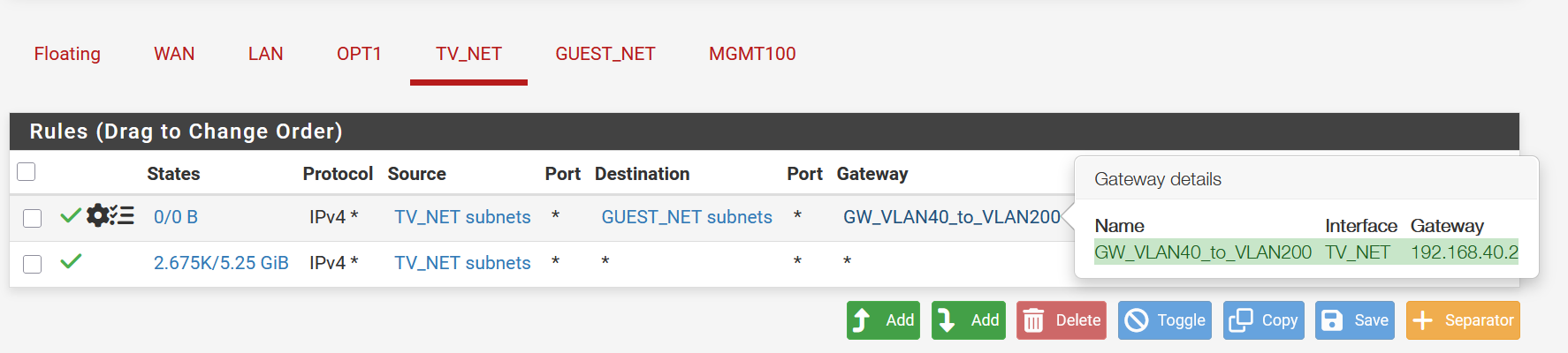 @johnpoz seem other vendors have no issue just creating static routes between the network. Unfortunately pfsense doesn't allow it because the route is already know. But we still need a rule from TV to Guest via the server as the gateway.