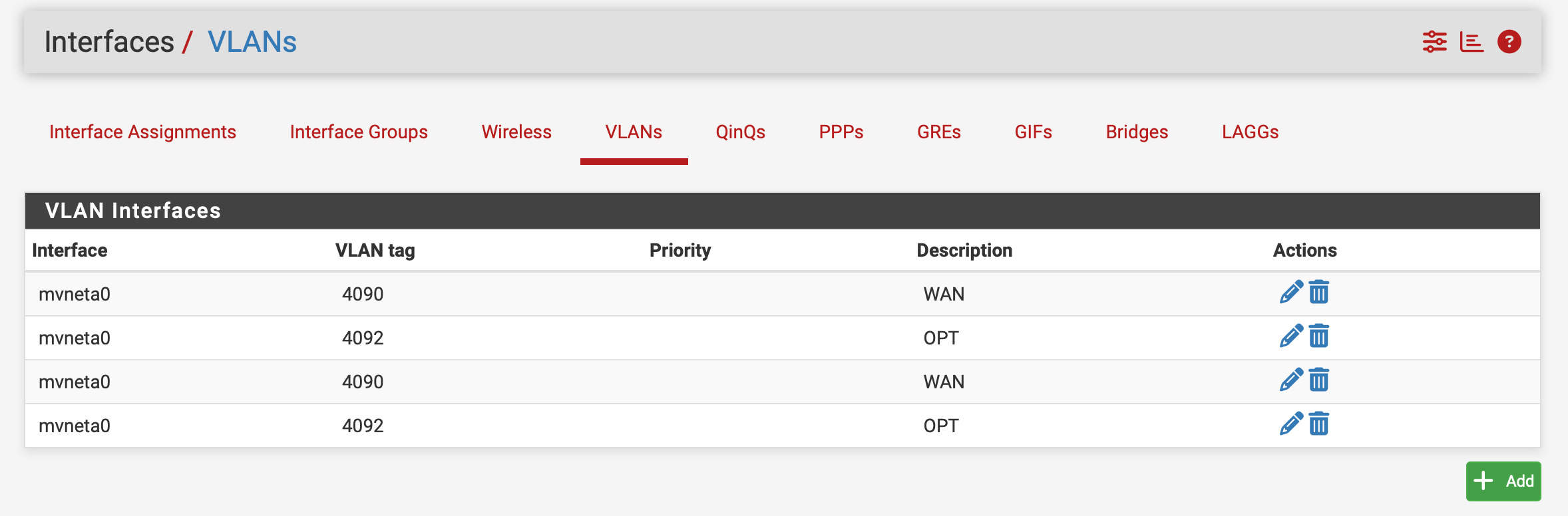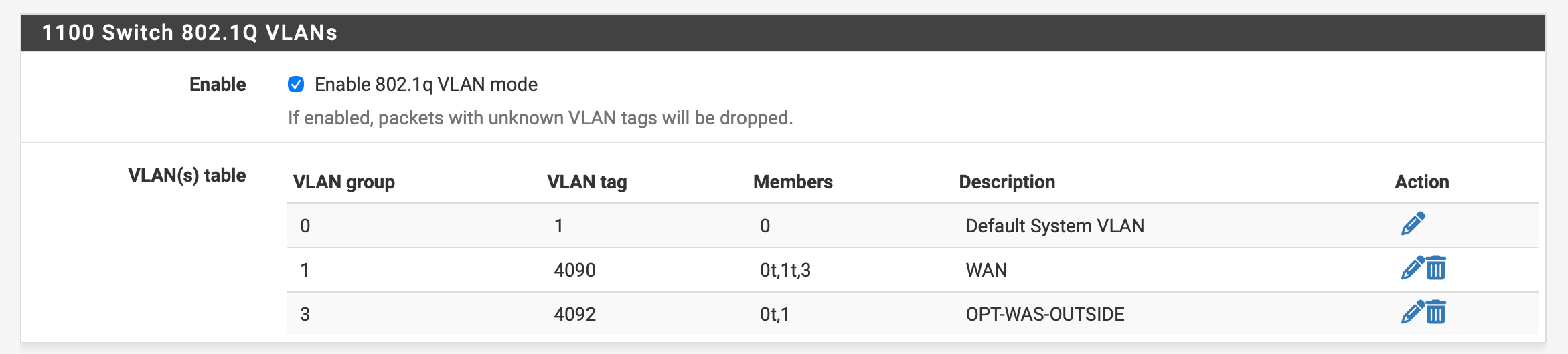 - When you have a device with an internal switch, you get two different "VLANs" config screens. There's the one under Interfaces --> Switches --> VLANs, and then there's the one under Interfaces --> Assignments --> VLANs, where (in the router-on-a-stick configuration, all your vlans show up twice):