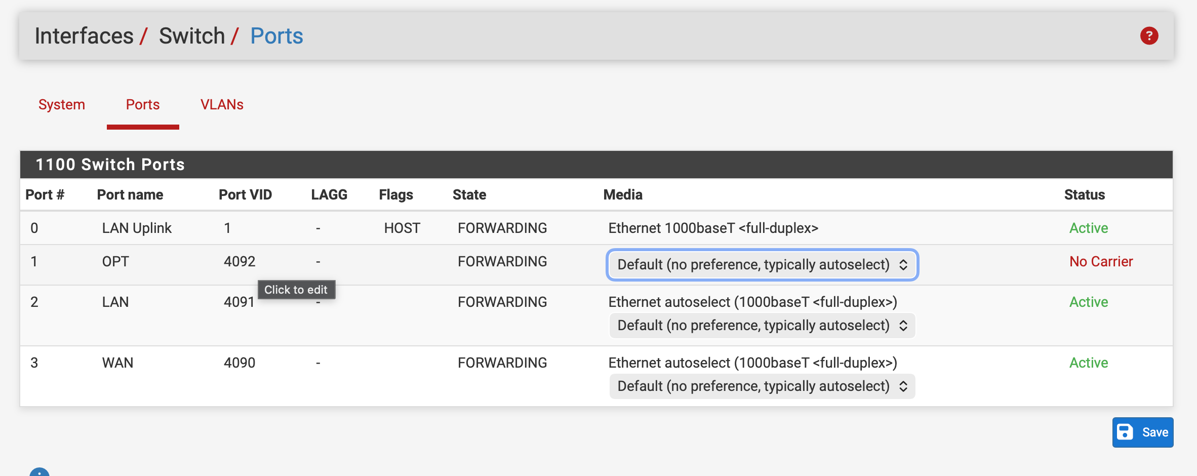 - Despite the whole router-on-a-stick setup, we're only feeding our OPT port an access port, and it would not work. (I thought that by setting the interface on Interfaces-->Switch-->VLANs to "