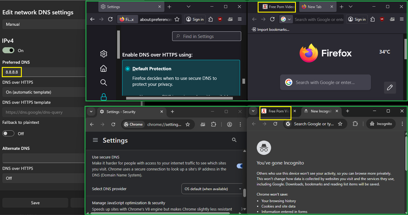 Good day. How do I block internet access of users who enabled their operating system's DNS over HTTPS? Below is screenshot from firefox and chrome showing it bypassed pfBlockerNG if Windows Settings' DNS over HTTPS is enabled: