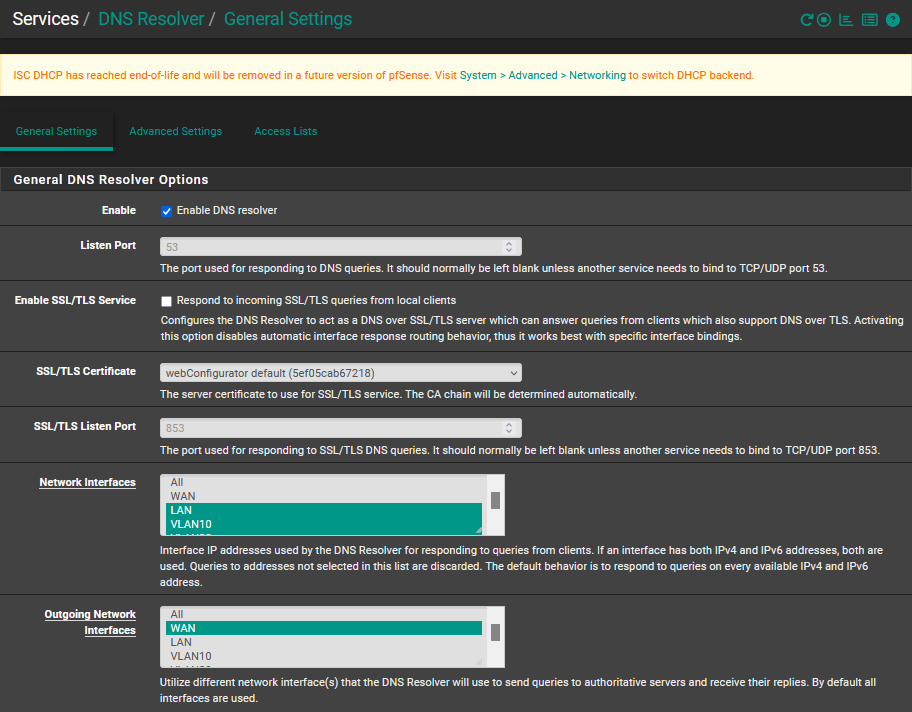 For the DNS Resolver: only the VLANs, LAN, and Localhost are selected in Network Interfaces. And only the WANs are selected in the Outgoing Network Interfaces: