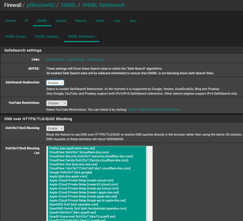 pfBlockerNG > DNSBL > DNSBL SafeSearch > DoH/DoT/DoQ Blocking is enabled and every entry on the list are selected: