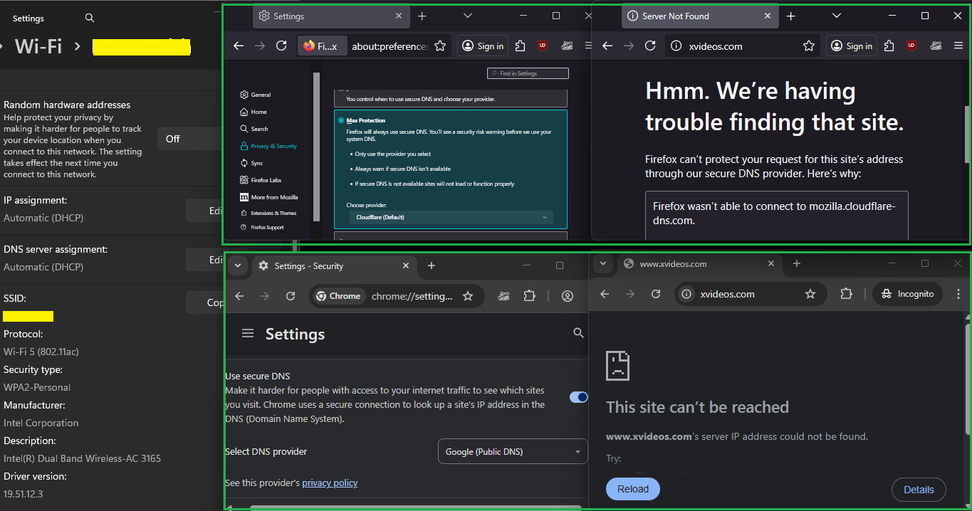 And also if Windows Settings' DNS over HTTPS is not enabled the pfBlockerNG blocking is still successful even when the browsers' secure DNS is enabled: