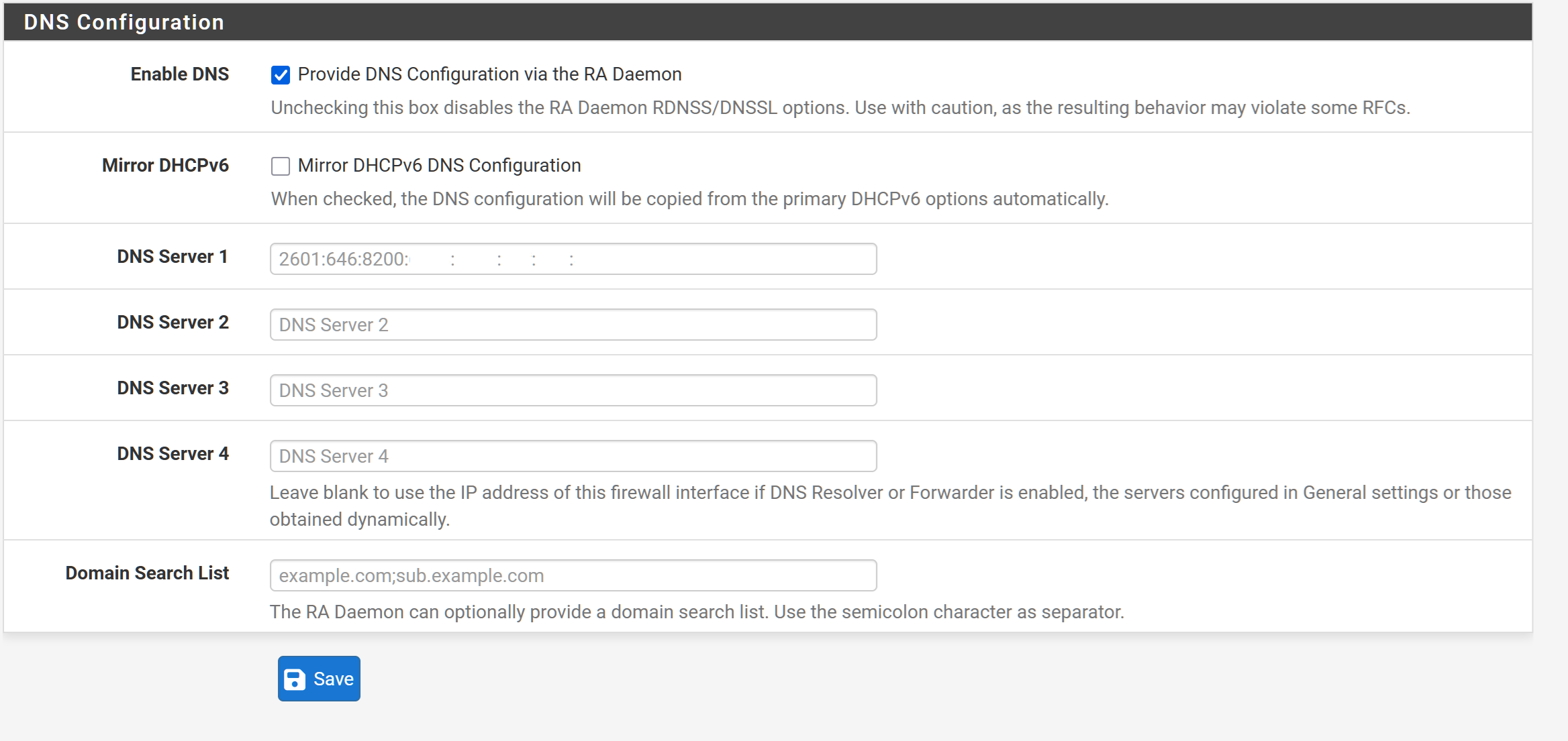 Ethernet adapter Ethernet 4: Connection-specific DNS Suffix . : localdomain IPv6 Address. . . . . . . . . . . : 2601:646:8200:reda::cted IPv6 Address. . . . . . . . . . . : 2601:646:8200:reda:cted:reda:cted:reda Temporary IPv6 Address. . . . . . : 2601:646:8200:reda:cted:reda:cted:reda Link-local IPv6 Address . . . . . : fe80::e280:2f0d:3e3f:a2%13 IPv4 Address. . . . . . . . . . . : 192.168.100.109 Subnet Mask . . . . . . . . . . . : 255.255.252.0 Default Gateway . . . . . . . . . : 192.168.100.1I have not changed any IPv6 related settings in pfSense recently.