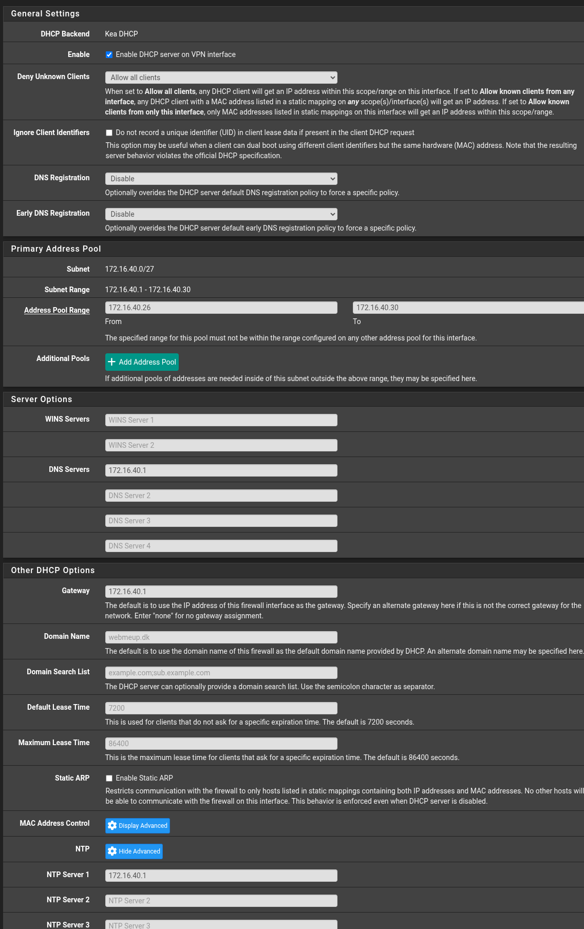 Yes - my DHCP announces my NTP and DNS - which is also is listening on the interface on my VLAN40 - 172.16.40.0/27 which is the subnet created on my PFsenseNTP: /root: sockstat -l | grep 'ntp' root ntpd 90006 37 udp6 fe80::287d:81ff:fe16:9e9e%vtnet1.40:123 *:* root ntpd 90006 38 udp4 172.16.40.1:123 *:* DNS: /root: sockstat -l | grep '53' unbound unbound 8040 15 udp4 172.16.40.1:53 *:* unbound unbound 8040 16 tcp4 172.16.40.1:53 *:* unbound unbound 8040 17 tcp4 172.16.40.1:853 *:*But my 2 klients as Nvidia SHield (A little gamin console and AndroidTV)