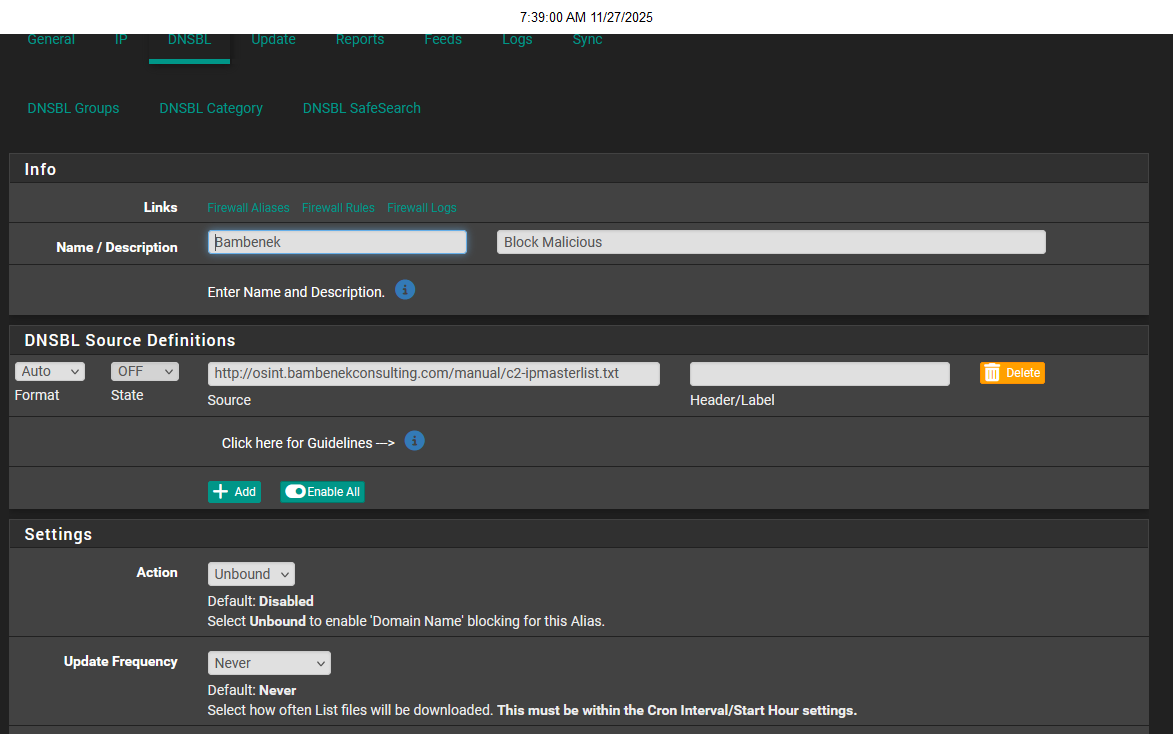 Hmmmm, for some reason, it doesn't appear the Bambenek feed is referencing a file in pfBlocker. DNSBL_Bambenek is white text and when you hover over the name, nothing pops up. The ones in green reference a file.