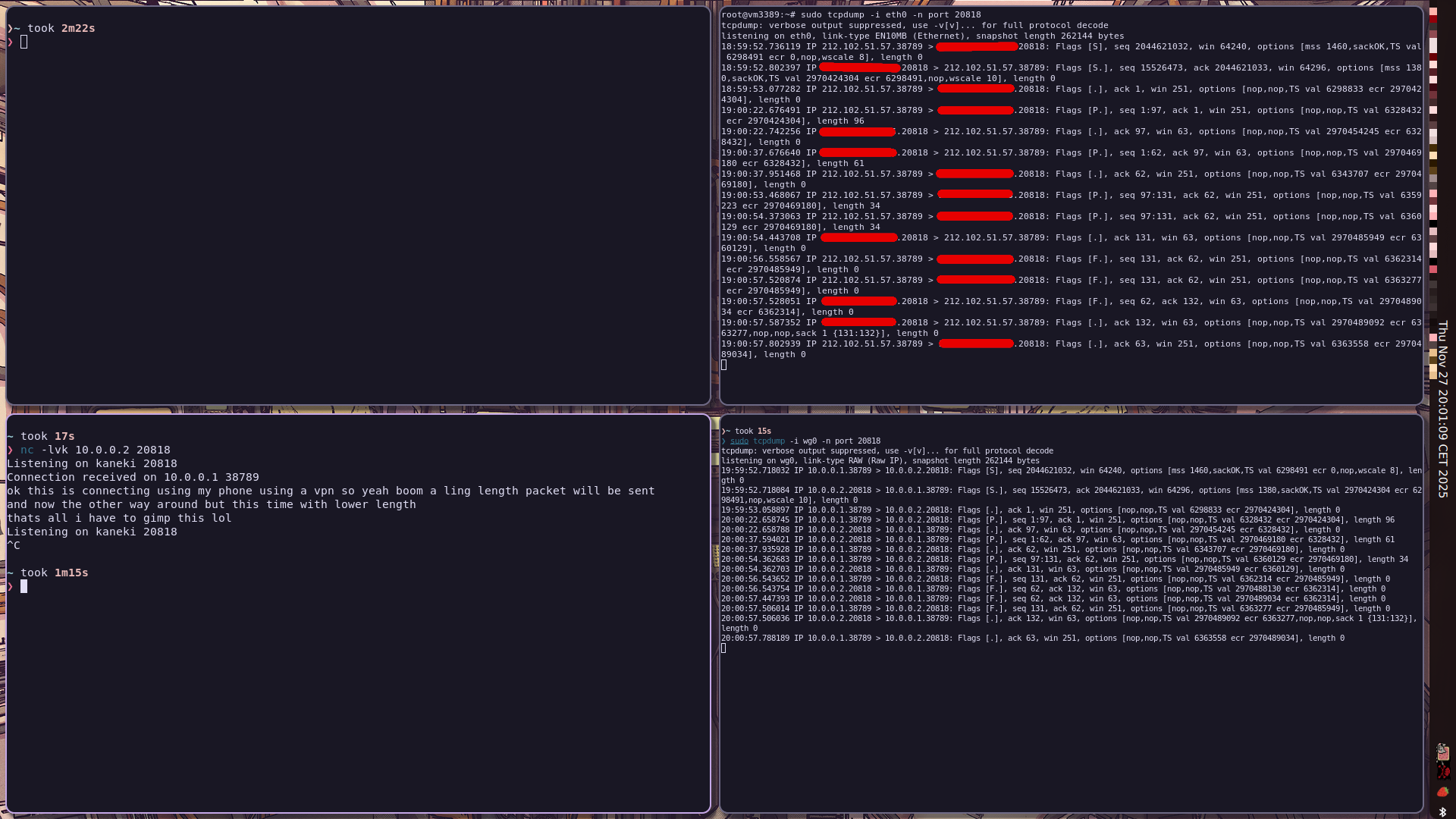 than by running sudo tcpdump -i wg0 -n port 20818 in the laptop I can see that the exchange is between 10.0.0.1 and 10.0.0.2 a screenshot cause why not